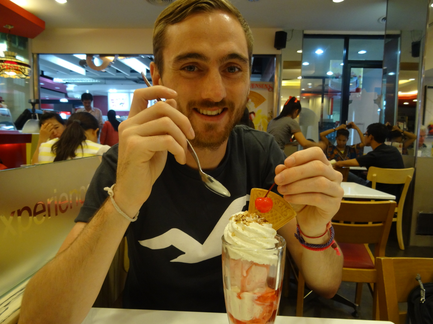 Turning my phone on I discovered he had text me to say immigration was taking ages. Did that mean he was in Thailand? Or did he have to do that in Singapore too? So many questions. We waited. And waited. And WAITED! We waited for so long that about 10 planes worth of passengers must have walked past us. He took so long he could have MAYBE brought a ball under control before he finally came out (joke for those who have seen Sam’s footballing skills).