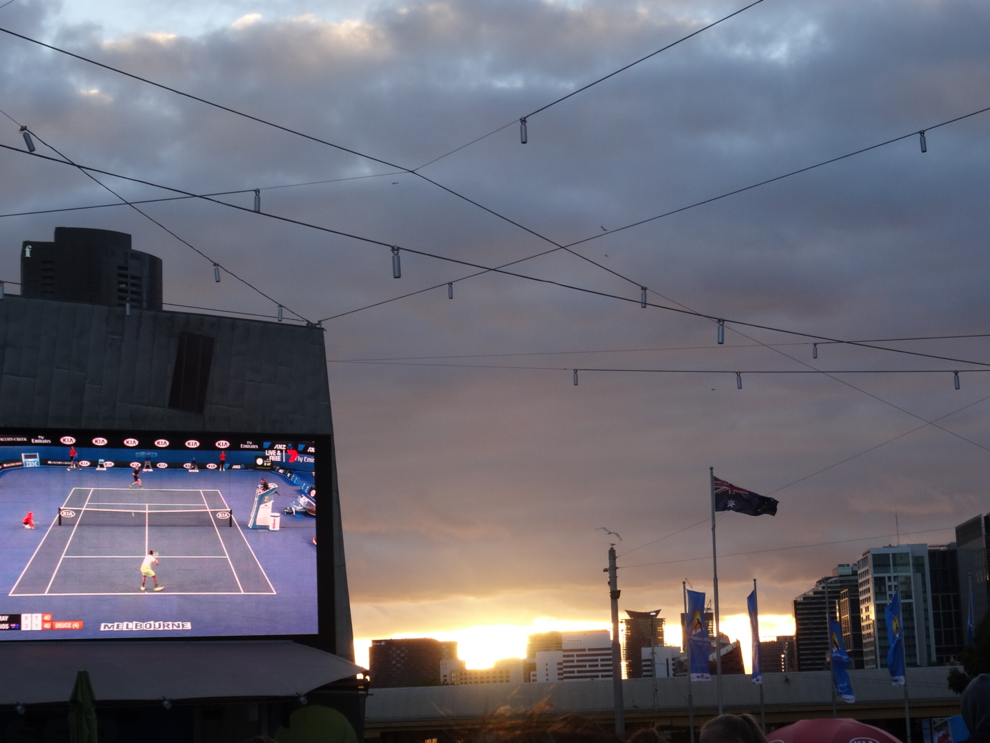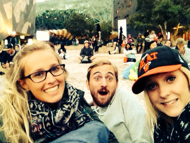 We left pretty sharpish, still hungry. No time to waste though. We were in the Australian capital of sport and our man Andy Murray was playing the Australian’s big hope in the tennis. It was to be shown on the big screen in Federation Square with a huge turn out expected. Of course it was more my idea than the girls but they were happy enough to tag along. We got our spot and joined the action midway through the first set. Although pretty cold it was a good watch. Especially as we won. The girls even got into it too, although not 100% sure on the rules.